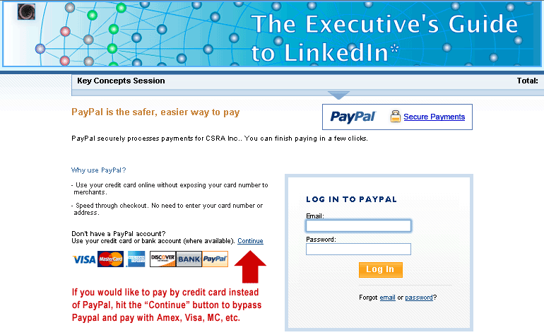 Social Networking BootcampUsing LinkedIn, Twitter and Blogging to Build Your BusinessWelcome to Part 2 of the EGLI registration site, which is only accessible after you have completed Part 1. All you need do here is hit one button, which will take you to Paypal, where you can pay with Visa, Mastercard, American Express, Discover or Paypal. If you are registering for a Collaborative Seminar only, you are assured a place in the seminar when you are among the first 25 people to complete payment. We apply group discounts when Enrollment closes. These are credited to the cards with which you made payment. You do not need to have a Paypal account; you can pay with major credit cards, although this can be difficult to see if you are not familiar with it. Please review the screen here to see what to do.